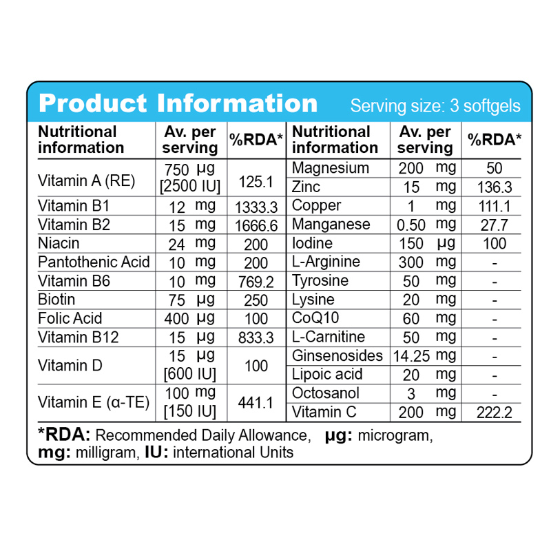 این مکمل دارای ویتامین های گروه ب، ویتامین دی، ویتامین سی، منیزیم، ید و … می باشد که هر کدام در سلامت عمومی بدن و تقویت سیستم ایمنی بدن نقش موثری دارند. همچنین، این مکمل با دارا بودن برخی از اسیدهای آمینه می تواند در عضله سازی نیز موثر باشد.