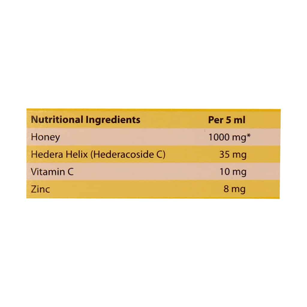 عسل، عصاره گیاه عشقه (هدراکوزاید سی)، ویتامین C، روی گلوکونات، گلیسیرین، پروپیلن گلیکول، سدیم بنزوات، اسید سیتریک، سوکروز، سدیم ادتا، زانتان گام، سوکرالز، سدیم متا بی سولفیت، اسانس لیمو و آب خالص.