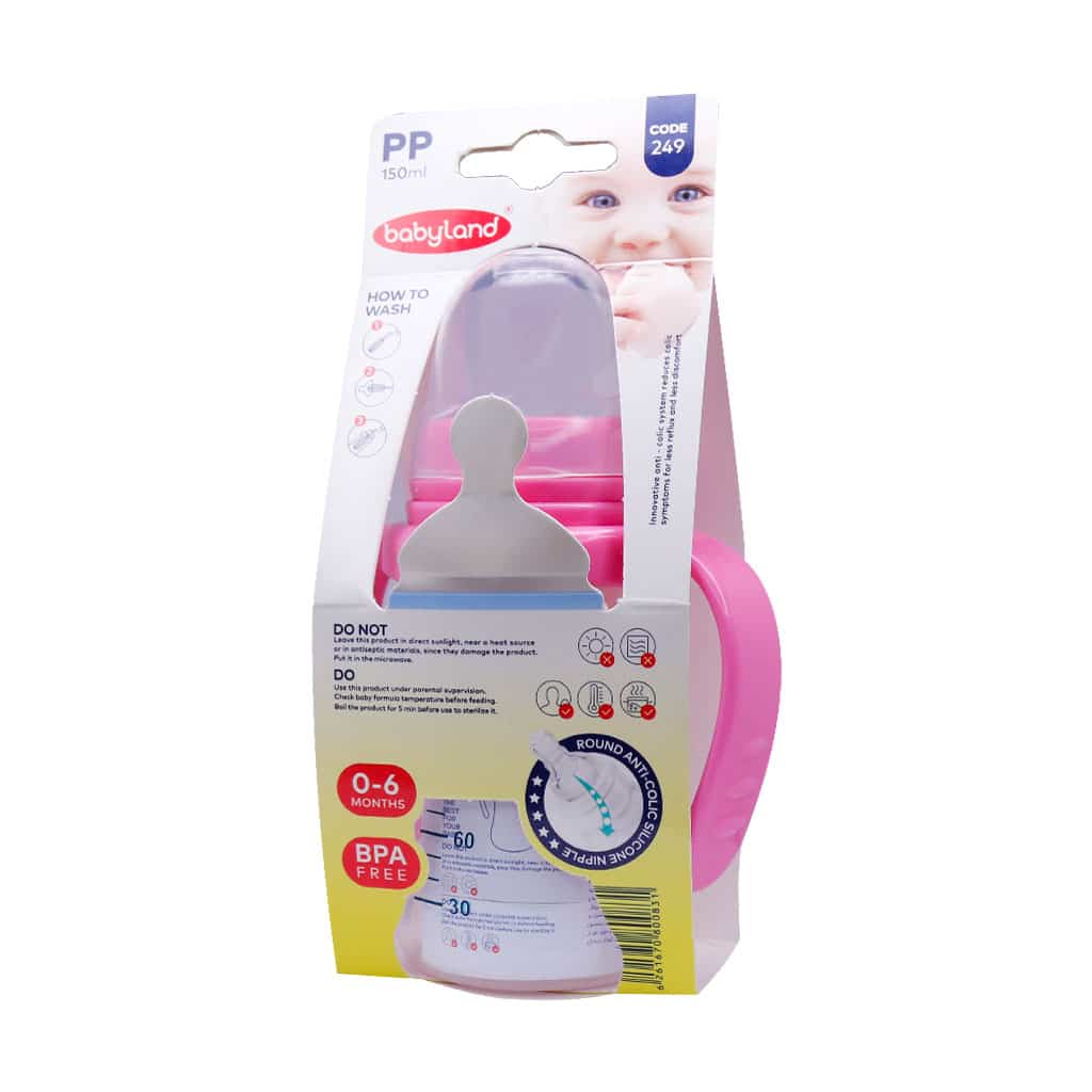 شیشه شیر دسته دار آنتی کولیک بیبی لند کد 249 مناسب نوزادان 0 تا 6 ماه بوده و فاقد BPA است. این شیشه شیر با سری فندوقی هیچ گونه آسیبی به فک نوزاد نمی‌رساند.