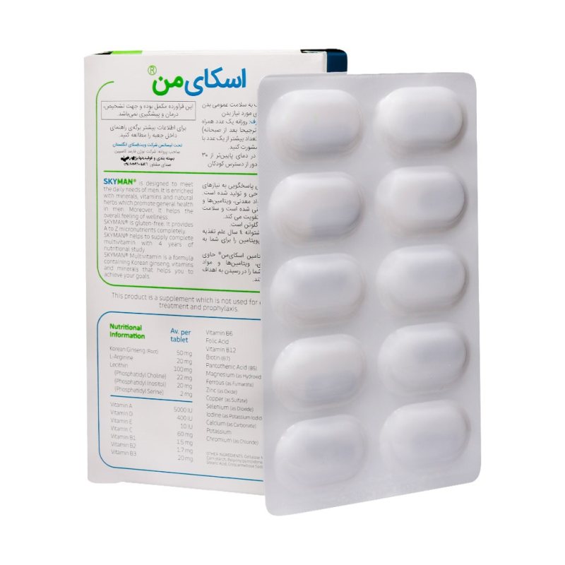 قرص اسکای من ویت اسکای با دارا بودن ویتامینها و مواد معدنی مورد نیاز آقایان، یک مکمل بسیار موثر شناخته شده است. این فراورده علاوه بر ویتامینها حاوی جینسینگ کرهای، ال آرژنین و لیستین نیز هست که هر یک تاثیرات بی نظیری دارند. مصرف اسکای من ویت اسکای به افزایش انرژی و حفظ سلامتی آقایان در تمامی سنین کمک مینماید. همچنین با کمک ترکیبات منحصر به فرد خود منجر به تقویت قوای جنسی، سلامت پروستات، افزایش متابولیسم پایه و قدرت عضلانی میشود. البته ناگفته نماند این فراورده با تامین ویتامینهای مورد نیاز بدن تقویت کننده سیستم ایمنی نیز هست.