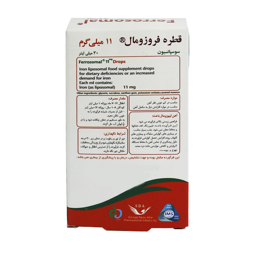 قطره آهن فروزومال ۱۱ میلی گرم سیمرغ دارو عطار یک مکمل مناسب برای تامین آهن مورد نیاز بدن کودکان است. قطرههای آهن موجود در بازار دارای عوارضی مانند سیاه شدن دندانها هستند، اما قطره آهن فروزومال سیمرغ دارای فرمولاسیون سوکروزومیال است که باعث فراهم زیستی بالای دارو میشود. مصرف این فرآورده باعث تغییر رنگ لثه و دندانها نمیشود. جذب این قطره در بیماریهای گوارشی، سلیاک و بیماریهای التهاب روده بسیار مناسب است. همچنین به دلیل پیشگیری از تماس آهن با مخاط دستگاه گوارش و کاهش عوارضی مانند درد معده و تهوع تحمل گوارشی دارو را بالا برده است.